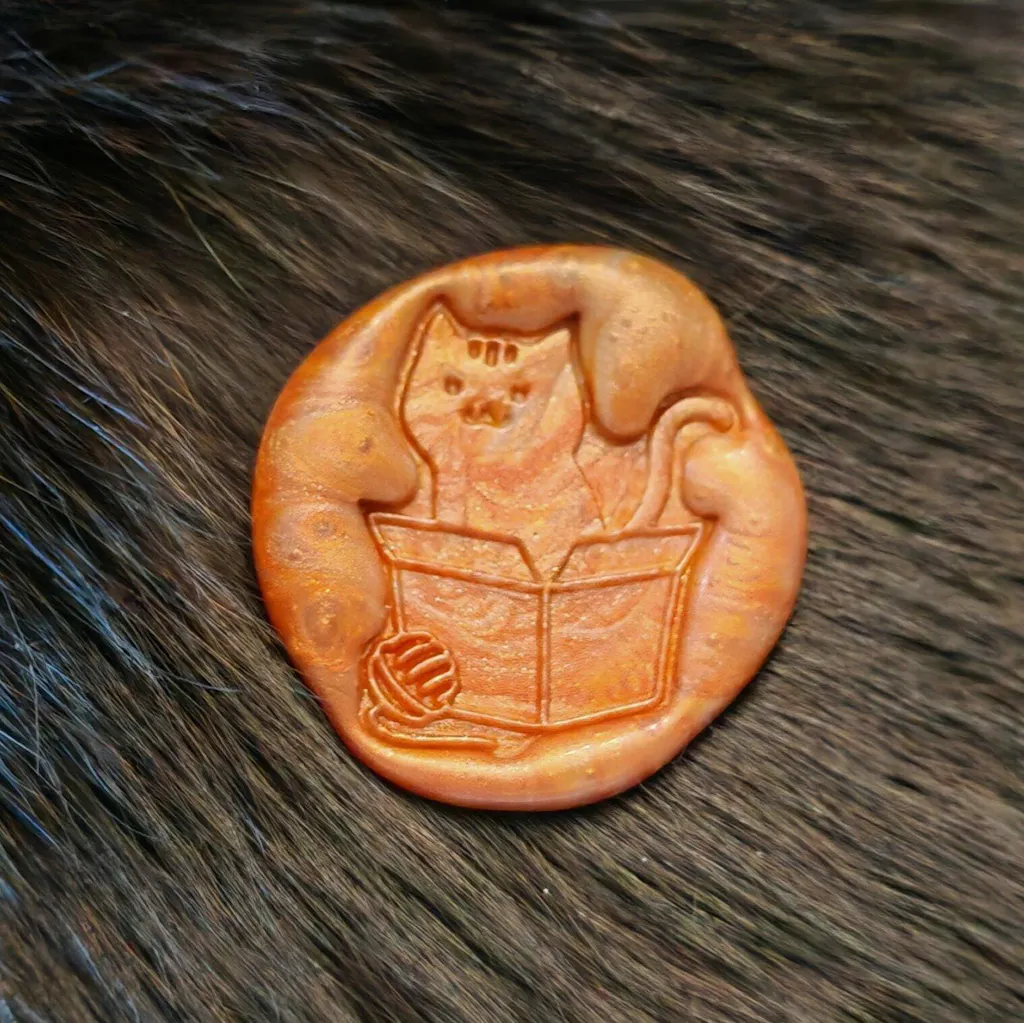 Kreiere die schönsten Designs mit dem Katze in einer Kiste - Siegelstempel! Perfekt für deine Karten, Geschenke, Verpackungen, (Hochzeits-)Einladungen oder Kreativprojekte. Dieser Siegelstempel ist 18x24 mm groß und mit nur 3 Wachsperlen kannst du entzückende Wachssiegel zaubern. Das Wachssiegel, das du auf dem Bild siehst, haben wir mit unseren Wachsperlen in Pastellila gemacht.