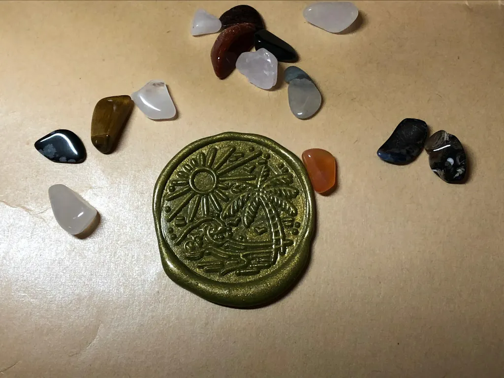 Kreiere die schönsten Designs mit dem Palmenstrand und Sonnenuntergang - Siegelstempel! Perfekt für deine Karten, Geschenke, Verpackungen, (Hochzeits-)Einladungen oder Kreativprojekte. Dieser Siegelstempel ist 30 mm groß und mit nur 4 Wachsperlen kannst du entzückende Wachssiegel zaubern. Das Wachssiegel, das du auf dem Bild siehst, haben wir mit unseren Wachsperlen in Bronze gemacht.